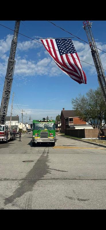 Engine Tanker 14 participating in the services for fallen East Berlin (NAFE 32) fireman Kevin Brehm under the colors flown by Arendtsville Tower 5 and Nashville (PA) Truck 11